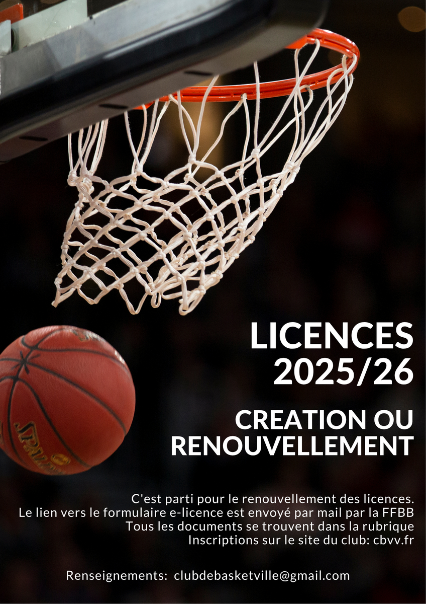 Renouvellement licence C'est reparti pour les inscriptions et renouvellement des licences pour la saison 2025/26. Réception du mail de la FFBB avec le lien pour faire la licence Réception d'un mail du club pour remplir le dossier d'inscription (fiche de renseignements ,autorisations, engagement...) à partir de la semaine prochaine. adresse mail du club: clubdebasketville@gmail.com